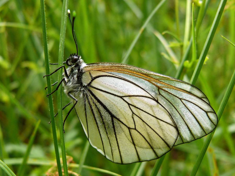 безбрежными (50-70 мм в размахе) белыми крыльями с черными жилками.