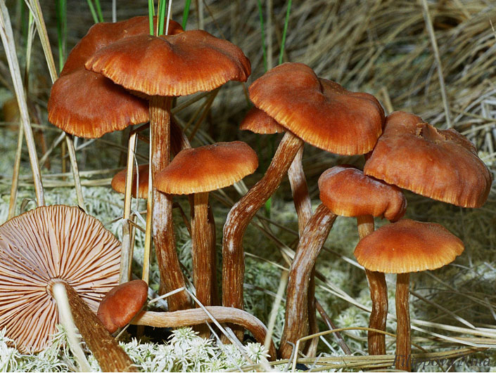 Лаковица большая представляет собой съедобный пластинчатый гриб. Растет поодиночке или небольшими группами с середины июля до середины сентября. Чаще всего ее можно встретить на мшистых участках лиственного, хвойного или смешанного леса, а также вблизи болот. Шляпка гриба выпуклая, с загнутыми вниз краями, но со временем становится распростертой, с небольшим углублением посередине, с прямыми или поднятыми вверх краями. Ее диаметр составляет около 10 см. Поверхность шляпки мелкочешуйчатая, влажная, кирпичного цвета, более светлая по краям. Спороносные пластинки широкие, приросшие, с неровными краями, окрашены в тот же цвет, что и шляпка, но имеют грязно-розоватый оттенок. Ножка округлая, прямая или перекрученная, внутри полая, высотой около 12 см при диаметре не более 0,5 см. Ее поверхность гладкая, матовая, буро-оранжевого цвета. Мякоть тонкая, водянистая, упругая, в ножке жесткая, без запаха и вкуса.